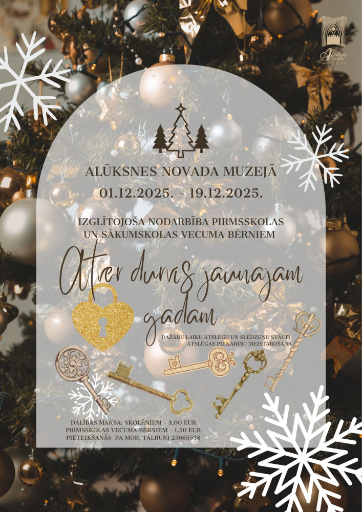 Ziemassvētku noskaņās no 1. līdz 19. decembrim aicinām bērnus uz izglītojošu nodarbību “Atver durvis jaunajam gadam”, lai iepazītu dažādu laiku atslēgas un slēdzenes, uzzinātu to stāstus un kopīgi darinātu savu īpašo atslēgas piekariņu – kā veiksmes un jaunu atklājumu simbolu jaunajam gadam.