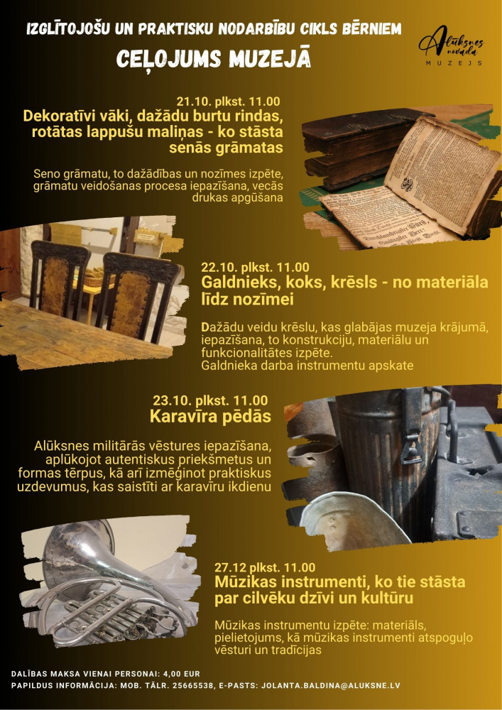 Alūksnes novada muzejs 2025. gadā piedāvā izglītojošas un praktiskas nodarbības bērniem dažādās tēmās ciklā “Ceļojums muzejā”, kas sniedz bērniem iespēju izzināt vēsturi aizraujošā un interaktīvā veidā - klausoties stāstus, pētot vēsturiskus priekšmetus un izmēģinot to darbību. Šī ir lieliska iespēja skolēniem un ģimenēm piedzīvot ko jaunu un iegūt atšķirīgu mācīšanās pieredzi.